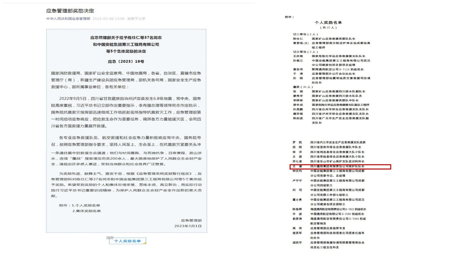 近日,应急管理部[2023]19号文件下发,对泸定抗震救灾表现突出的个人和集体进行奖励,新利(中国)矿山救护队队长王谦榜上有名。
