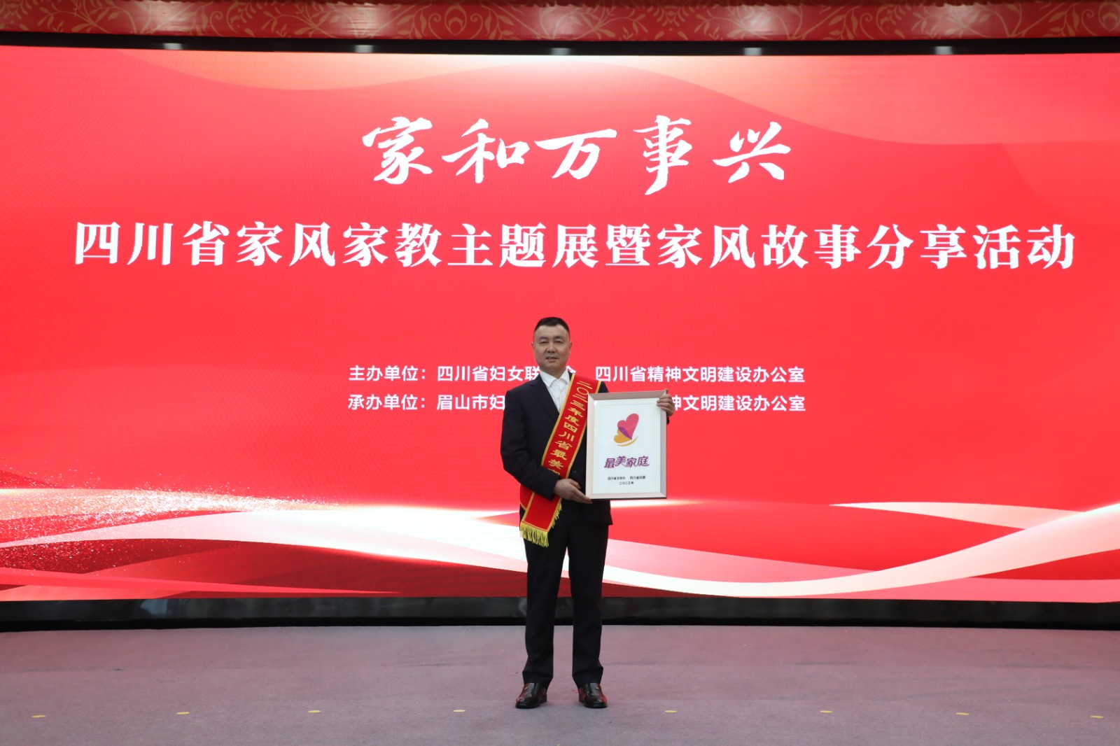 活动现场,省文明办副主任胡伟、眉山市人大常委会副主任王泽文为最美家庭代表颁奖。活动还开展了家风故事分享、“四川省家和万事兴——家风家教主题展”启动仪式等。