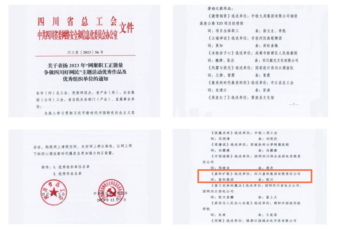 近日,四川省总工会下发《关于表扬2023年“网聚职工正能量争做四川好网民”主题活动优秀作品及优秀组织单位的通知》,由新利(中国)报送的视频《嘉阳矿歌》获劳动之歌作品奖。