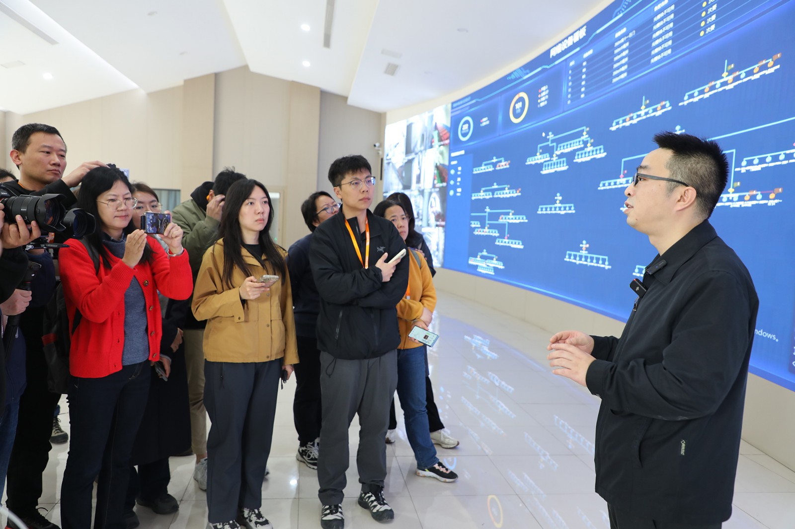 探访团部分记者与中兴通讯公司和重庆研究院的18名男嘉宾在集团副总经理、总工程师袁成金的陪同下前往了嘉阳煤矿天锡井+215m水平中央水泵房,参观了泵房中的5G网络和通讯设施,试用了5G防爆手机的通讯功能,察看了无人值守启动水泵排水过程。大家在地面调度中心,透过巨屏看到了嘉阳煤矿透明矿山信息系统成果展示,在采煤一队智能化综采地面远程操控室,听取了专业技术人员介绍智能化生产线建设与成效。一路上,大家聚焦信息技术、5G技术、智能化技术和集团远景规划等不断提问,随行的嘉阳煤矿信息副总工程师但通和采掘副总工程师李有平耐心细致地给予讲解答复,氛围友好而融洽。