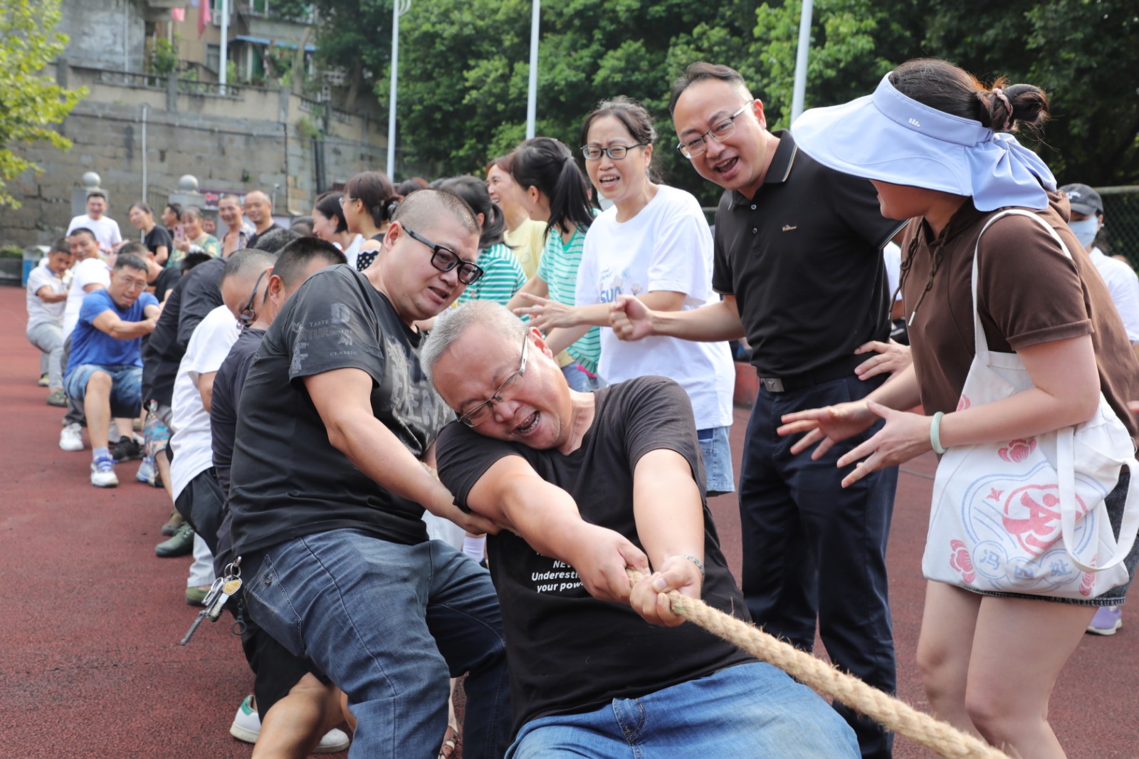 现场参赛男子组12个队,女子组4个队,男子组分4个组比赛,小组第一名出线后进行交叉比赛;女子组采用单循环赛,每场比赛均采用三局二胜赛制。比赛尚未开始,双方就已进入“战斗”状态,双手紧握绳子,双脚用力着地,身体向后微倾,随着一声哨响,队员们都铆足了劲往后拉,憋得满脸通红,反复争夺;落后一局的队员在交换场地后打气鼓劲,使出浑身解数,势在扭转局面。这已不是一场简单的战队实力之间的较量,参赛队员们秉承煤矿“燃烧精神”,通力合作,齐心协力,个个精神抖擞、斗志昂扬,拉拉队员和观众们心潮澎湃,情绪激扬的助威呐喊将拔河比赛推向了高潮。