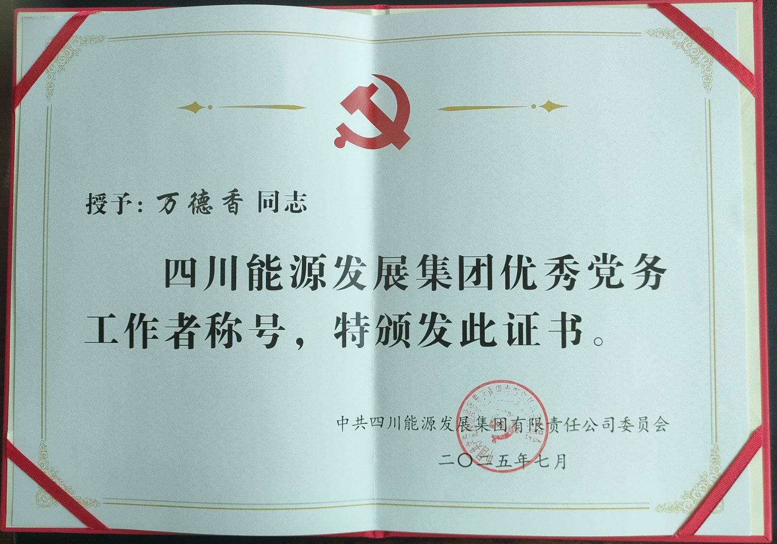 近日,四川能源发展集团表彰2024年度优秀共产党员、优秀党务工作者、先进党组织,万德香、张献云、周学军,采煤一队党支部,喜获表彰。