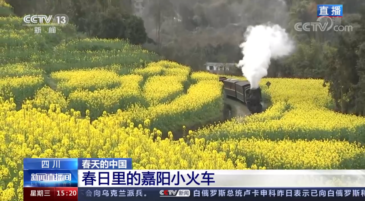 3月2日下午3时,中央电视台新闻频道新闻直播间“春天的中国”特别直播节目正式播出。随着金黄色的油菜花在现场连线镜头中的惊艳亮相,全中国的目光再一次聚焦“春日里的嘉阳小火车”。