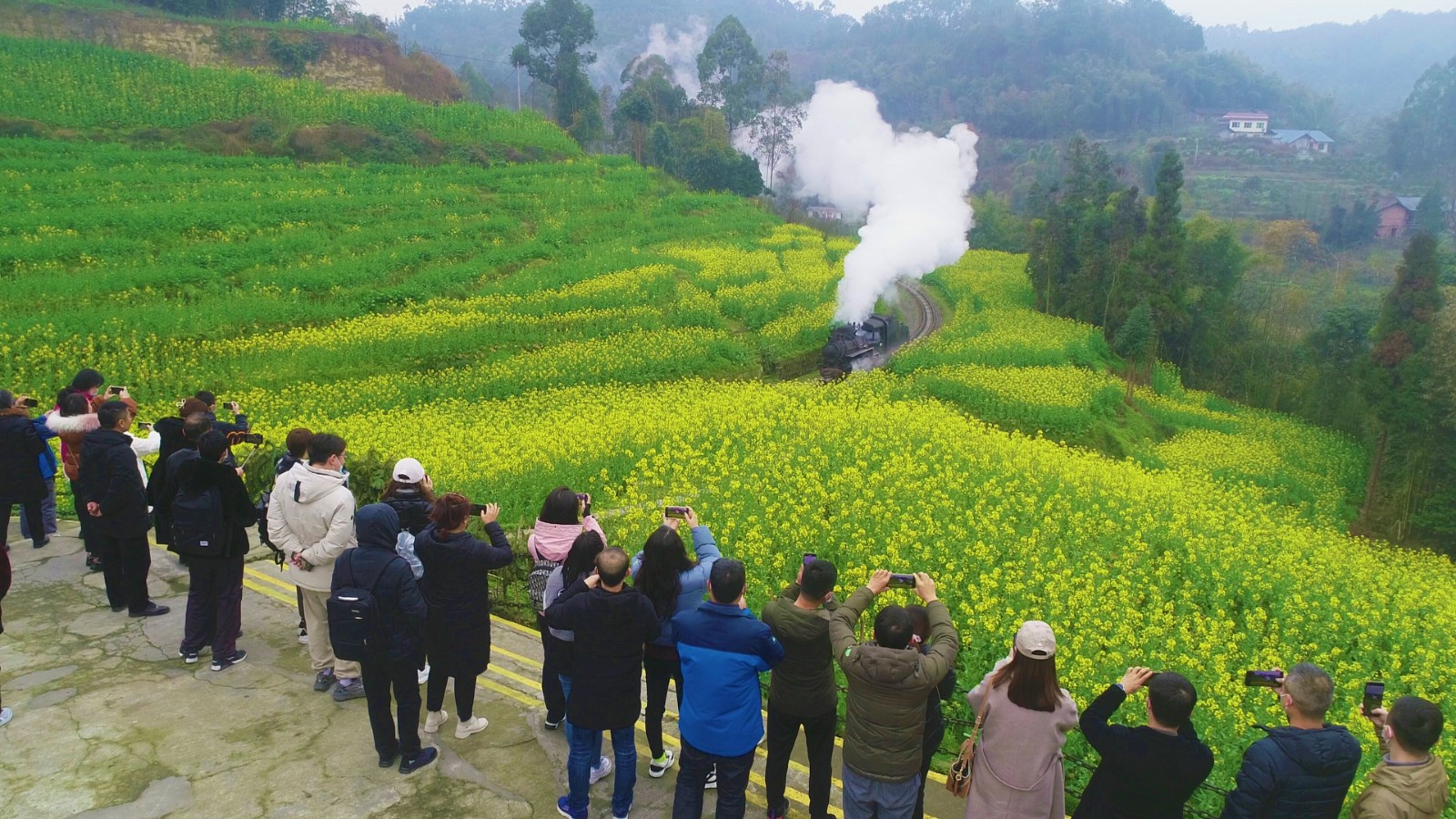 媒体团采风的第一站是嘉阳小火车跃进站,从这里搭乘历史悠久的窄轨蒸汽小火车,沿着蜿蜒旖旎的芭石铁路前行,一路欣赏与记录青山绿水与农业生态新面貌。在这春意盎然的绝美旅途中,媒体团先后在段家湾及亮水沱驻足停留,欣赏小火车穿越油菜花海与“铁龙飞虹”的靓丽画卷,并为现场的新人伉俪拍摄婚纱照片,共同见证浪漫爱情。