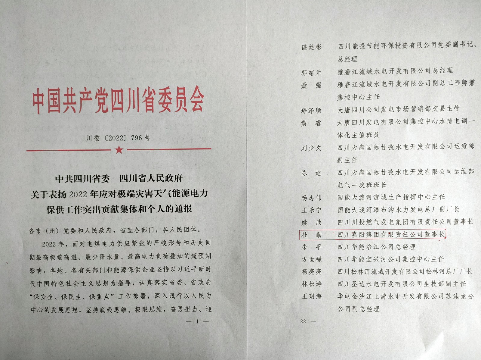 近日,中共四川省委 四川省人民政府对2022年应对极端灾害天气能源电力保供工作突出贡献集体和个人进行通报表扬,新利(中国)党委书记、董事长杜勤榜上有名,再获殊荣。